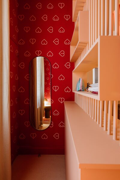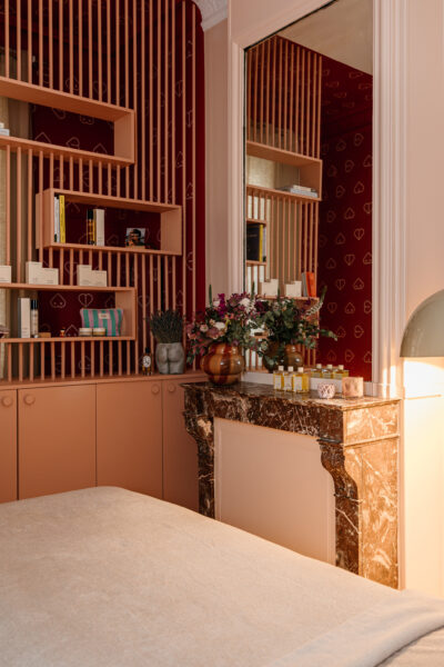 Notre défi résidait dans une surface au sol extrêmement réduite et une hauteur sous plafond très importante. La création de rangements était indispensable pour limiter l’encombrement au quotidien. Nous avons donc créé un placard sur mesure pourvue d’une niche qui fait office de plan de travail. Nous avons également ajouté des rangements bas, surmontés d’un claustra de quelques étagères pour pouvoir exposer le merchandising de cette jolie pépite en plein essor.